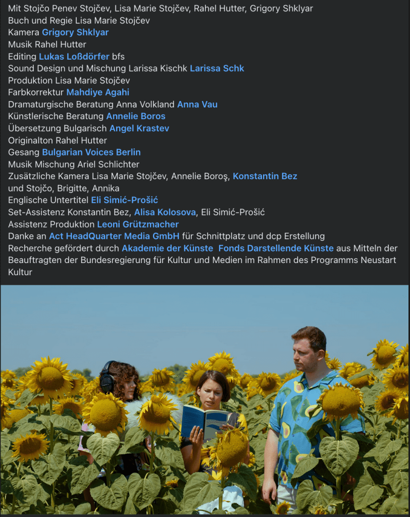 Dramaturgische Beratung für den dokumentarischen Essayfilm „Това беше 1965, / This was 1965, / Das war 1965,“ von Lisa Marie Stojčev (Text, Regie, Performance), gefördert u.a. durch die Rechercheförderung der Akademie der Künste und des Fonds Darstellende Künste, Deutschland/Bulgarien, 2022-25; Premiere am 24.03.2025, Filmfestival Sofia (BG) > Nächstes Screening im Juli 25 beim Rhodope Film Fest